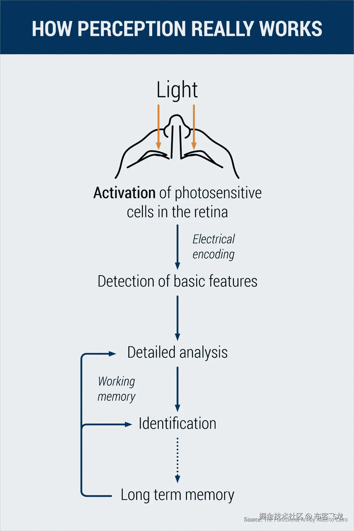 一旦光被编码成电信号,大脑就会提取主要特征,从粗略的形状和颜色开始,然后才开始真正处理和识别人面前的东西,使用长期记忆中的大量信息。