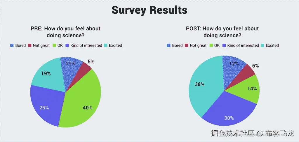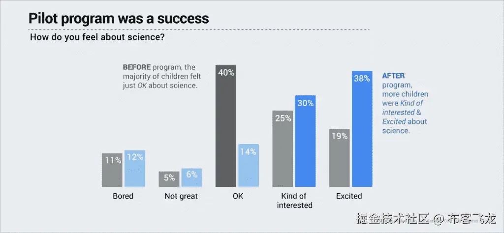 现在看看以完全不同的方式呈现的相同数据集。差别很大,对吧?核心信息是显而易见的:节目结束后,更多的孩子对科学感到兴奋。