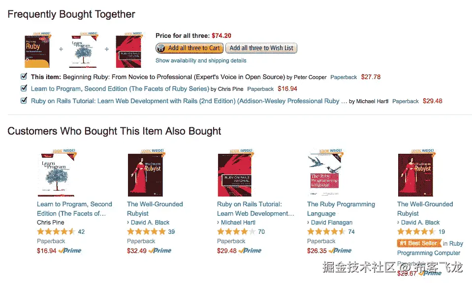 - **项目-项目协同过滤:**它与前面的算法非常相似,但我们不是寻找看起来相似的客户,而是尝试寻找看起来相似的项目。一旦我们有了商品外观相似矩阵,我们就可以很容易地向从商店购买了任何商品的顾客推荐相似的商品。这种算法比用户-用户协同过滤需要更少的资源。因此,对于一个新客户,该算法比用户-用户协作花费的时间少得多,因为我们不需要客户之间的所有相似性得分。亚马逊在其推荐引擎中使用这种方法来显示促进销售的相关产品。