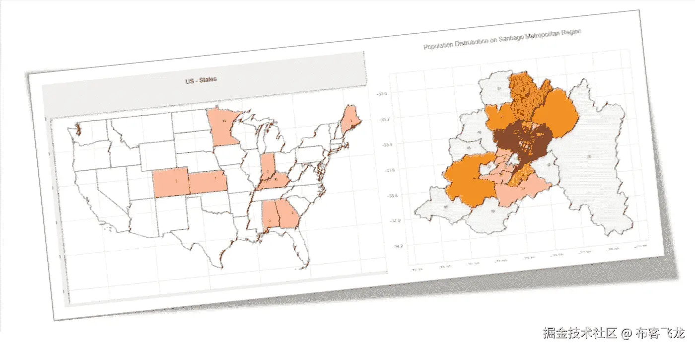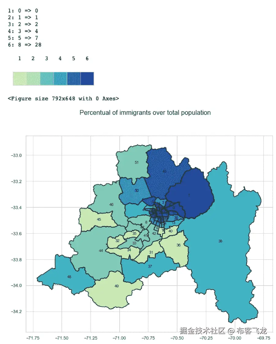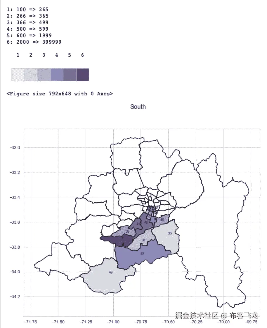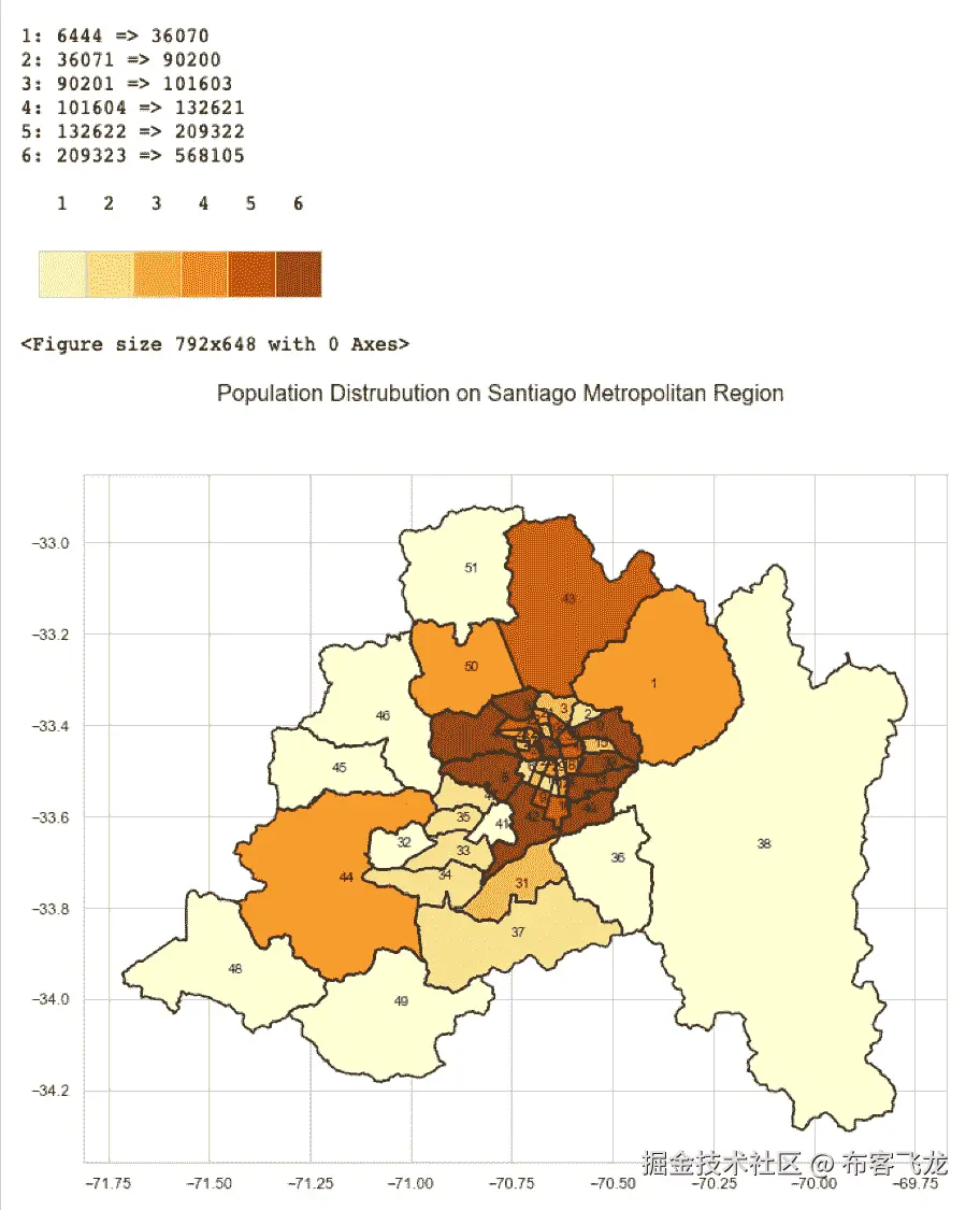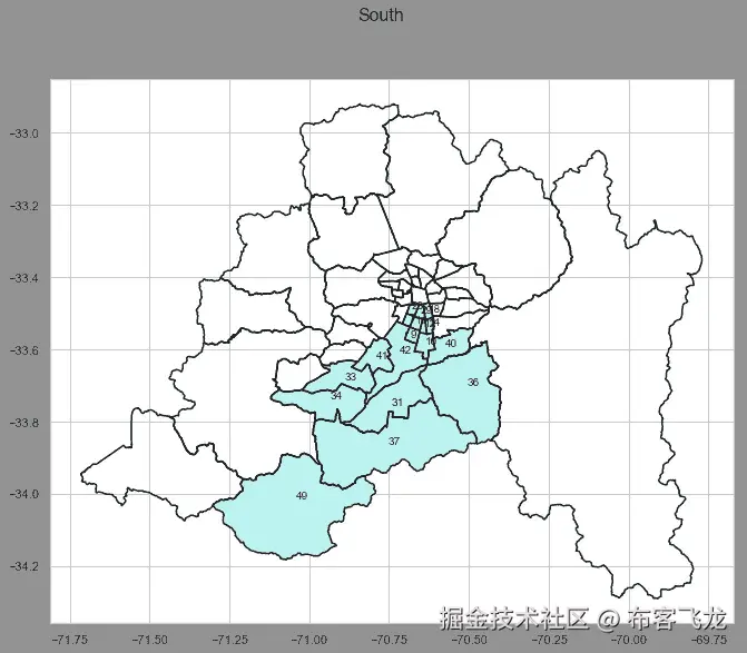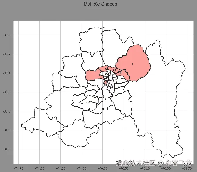 这意味着在我们的形状文件中存在 52 个形状,一旦圣地亚哥大都会区有 52 个“comunas”,如下图所示(不要担心,在本文结束之前,您将学习如何直接从您的数据创建这样的地图):
