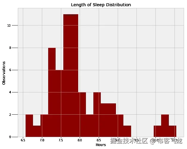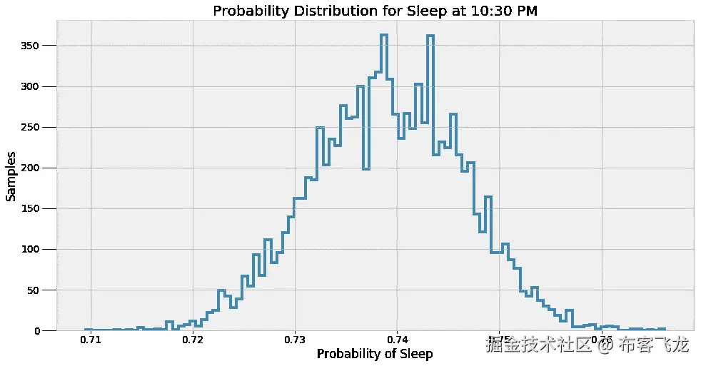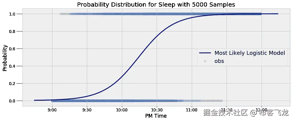 看起来很合身!我们可以查询该模型,以找到我至少获得一定量睡眠的可能性以及最可能的睡眠持续时间: