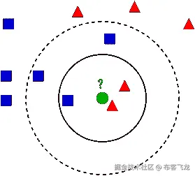我们可以看到中间的绿色圆圈。它最接近三角形,所以它可能会被归类为三角形。我说“可能”是因为没有定义“K”。这个“K”表示应该考虑多少个项目。如果“K”是 3,则该圆应归类为三角形(两个三角形对一个正方形)。但是如果“K”是 5,那么该圆应该被归类为正方形(三个正方形对两个三角形)。 大多数时候“K”的默认值是 3(较大的“K”表示不敏感)。