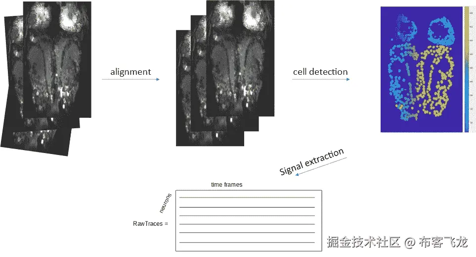 已经很酷了!然而,在能够使用一些机器学习算法(如 PCA 或聚类)之前,我们需要将该视频转换为可利用的数据集,即[神经元 x 时间]的 2D 矩阵,其中每个元素都是特定神经元在特定时间点的活动程度。“预处理”管道有 3 个主要步骤: