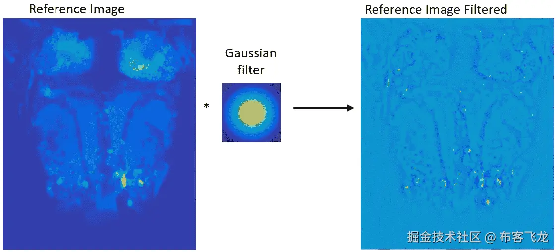 这可以通过使用高斯滤波器(或 内核 )的 2D 卷积来完成。每个像素的值将被原始图像和高斯核之间的卷积所取代。这在下面的示意图中有很好的描述: