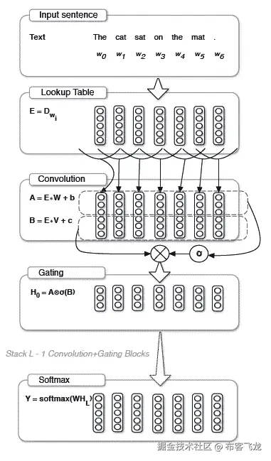 Dauphin 等人的 CNN 类似地将大小为[ seq_length,emb_sz ]的嵌入激活作为输入,但随后使用多层门控卷积来产生最终的隐藏状态输出 H (也是大小为[ seq_length,c_out )。每层包括 1)产生两个独立卷积输出的卷积块,以及 2)使用一个卷积输出来选通另一个卷积输出的选通块。