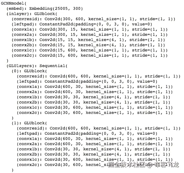 如上所述,卷积模块实际上会产生两个独立的卷积输出, A 和 B ,其中一个将通过逐元素乘法来选通另一个。第一卷积输出被计算为 A = XW+b* 。因为 X 是一个大小为[ seq_length,emb_sz ]的张量,所以在用零进行左填充之后,它的大小将为[ seq_length+k-1,emb_sz ]。w 是大小为[ k,in_c,out_c ]的卷积滤波器,其中 in_c 是输入通道数(这里等于第一层的 emb_sz ),而 out_c 是输出通道数。 b 是长度 out_c 的偏置向量。在应用卷积之后,输出 A 将是 size [ seq_length,out_c ]。最后,对 B= XV+c* …执行相同的步骤,即使用不同的卷积滤波器 V 和偏置向量 c 产生第二个输出 B 。
