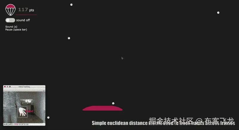 注意,手检测是在逐帧的基础上完成的,并且系统不会跨帧自动跟踪手。然而,这种类型的帧间跟踪是有用的,因为它可以实现多用户交互,我们需要跨帧跟踪手(想象一群朋友挥舞着他们的手或其他一些共同的对象,每个人都控制着自己的球拍)。为此,当前的实现包括基于朴素欧几里德距离的跟踪,其中在跨帧的相似位置看到的手被分配相同的 id。