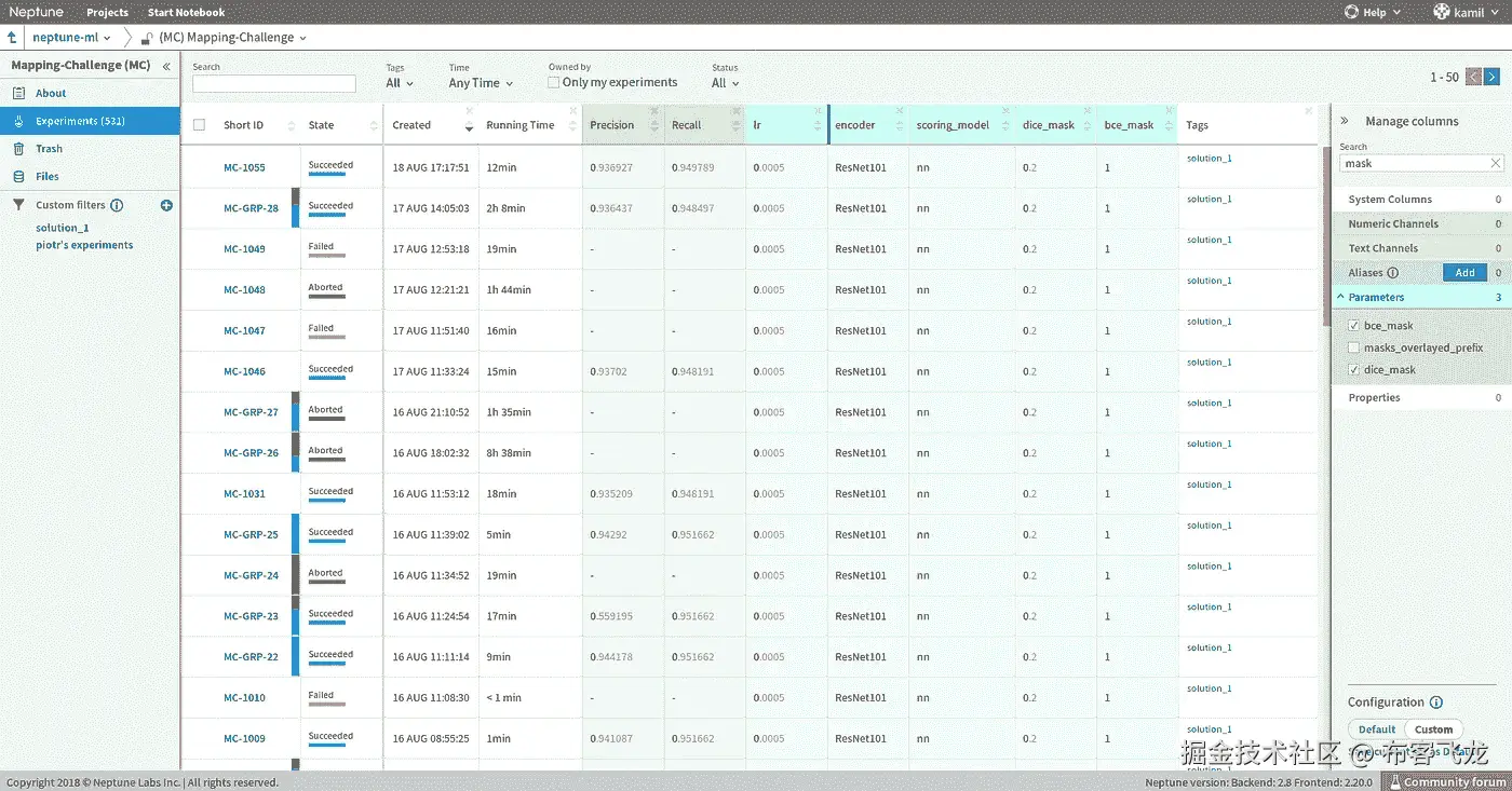 快速实验 —多亏了清洁解决方案开发流程,我们能够顺利地重复想法。从第一天开始,所有实验都在我们的数据科学项目平台 neptune.ml 上运行。与实验相关的所有工件都放在一个地方:结果、输出、保存的模型、代码、图表、超参数——非常方便,并且创建了一个比较结果和查看彼此工作的公共场所。这变得很方便,因为实验的数量很快就超过了 100 次(到目前为止,我们已经进行了超过 1000 次实验,这些实验都是公开的😎).
