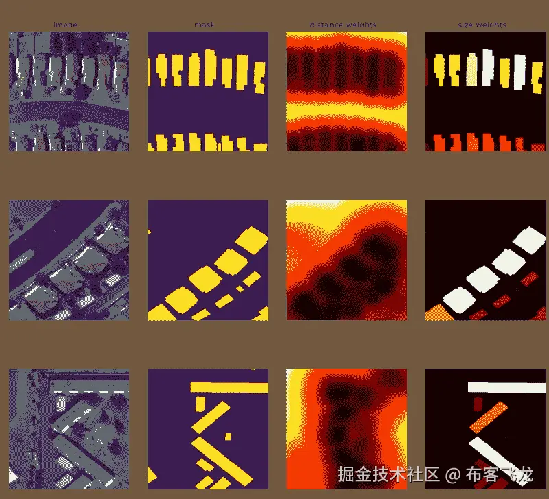 1st column is input image, 2nd column is mask, 3rd column visualizes distances between buildings (darker color is higher value), 4th column visualizes weight assigned to the roof (smaller roofs are assigned higher values, background is fixed to black).