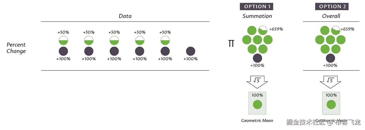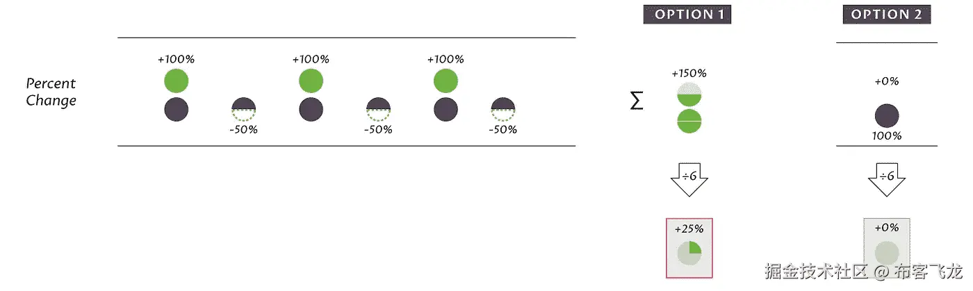 但是在加法的土地上,这两项并不平衡:200% + 50% = 250%,平均变化 125%。我们应该得到的结果是 100%。