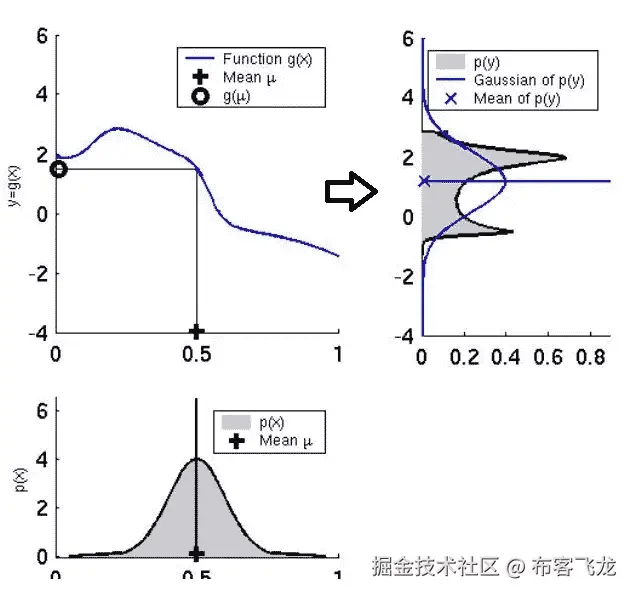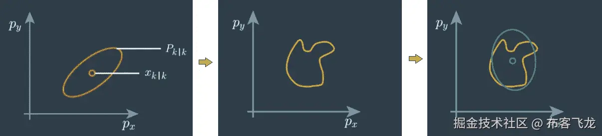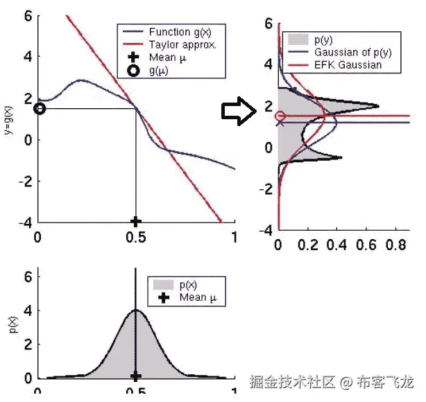因此,如果我们应用非线性函数,它将不会以高斯分布结束,我们不能再应用卡尔曼滤波器了。非线性破坏了高斯分布,计算平均值和方差是没有意义的。