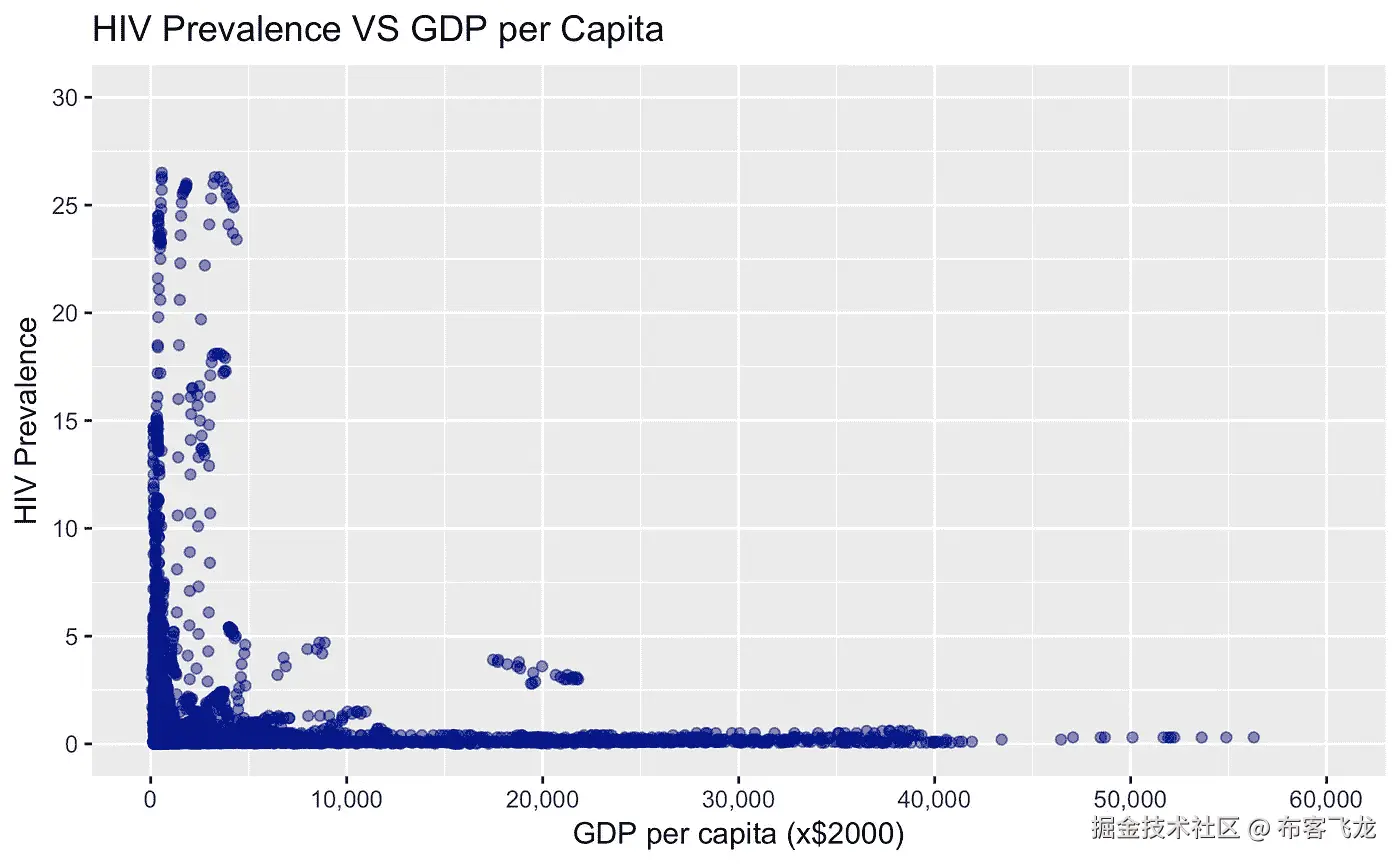 散点图清楚地表明,与人均国内生产总值较高的国家相比,人均国内生产总值较低的数据点(即国家)的艾滋病毒流行率要高得多。