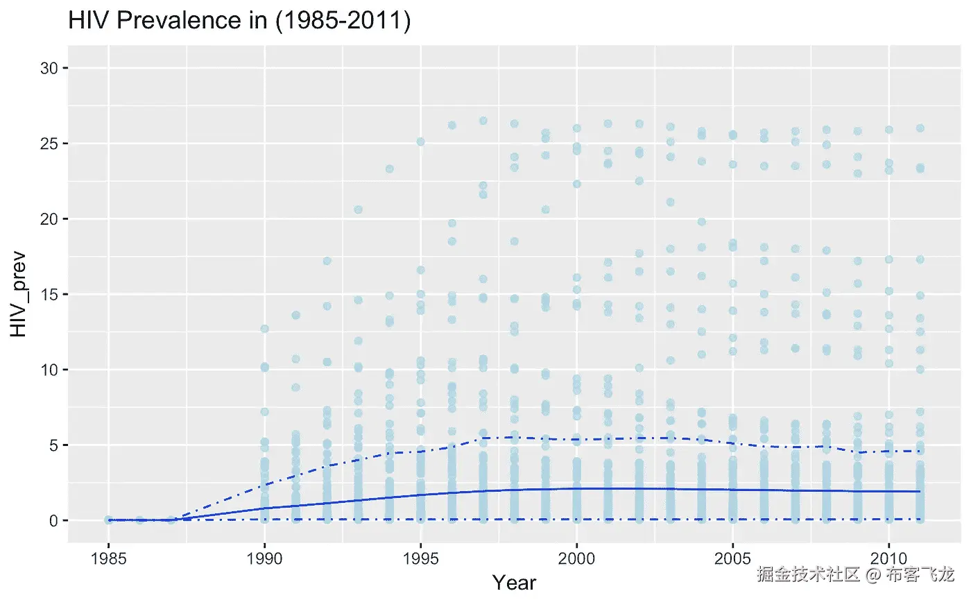 与人均 GPD 类似,我们也叠加了平均值和上下限(5%;95%)的艾滋病毒感染率。我们将关注 1985 年至 2011 年的数据。