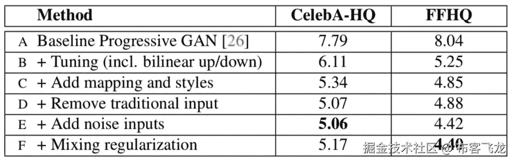 该论文展示了两个数据集的最新成果——由名人图像组成的 CelebA-HQ,以及由“普通”人图像组成的更加多样化的新数据集 Flickr-Faces-HQ (FFHQ)。下图显示了模型不同配置的 Frèchet 初始距离( FID )得分。