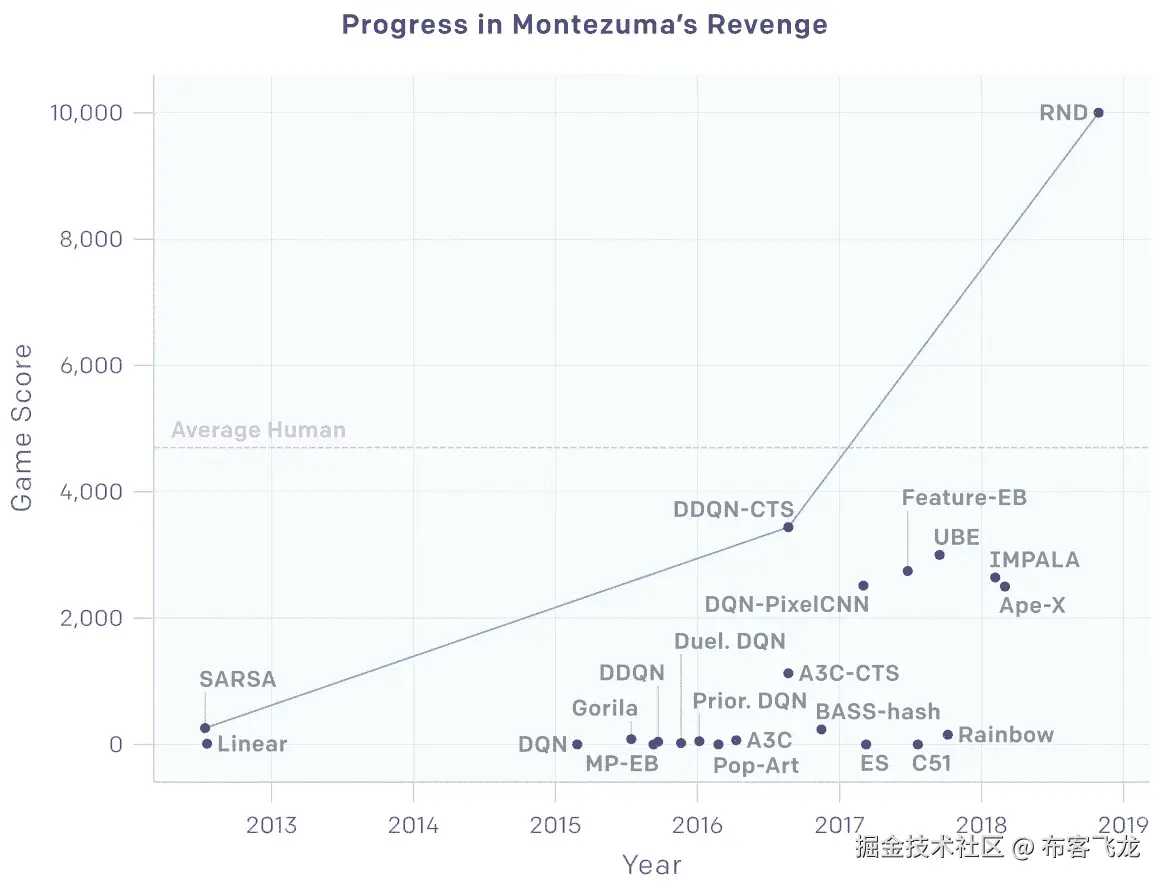 这些方法比只基于外在奖励的模型(如著名的 DQN 和 A3C 模型)表现得更好,但仍然比普通人差。