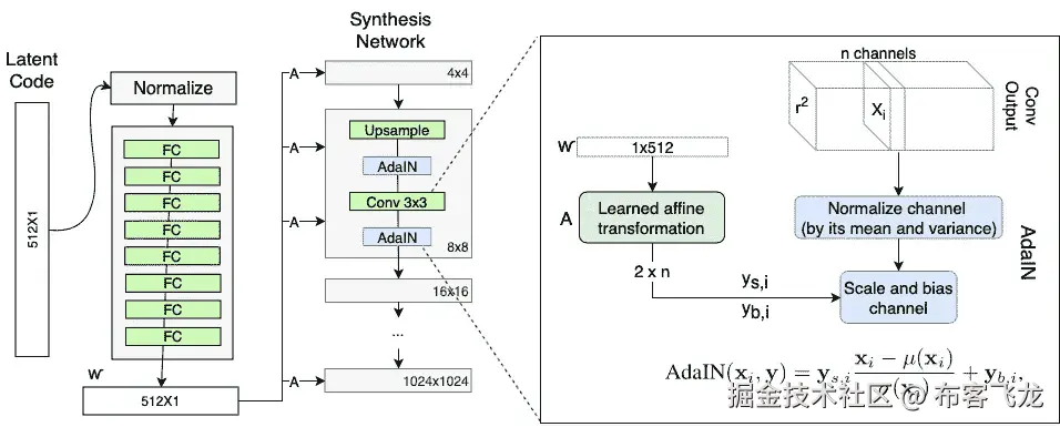 AdaIN (自适应实例标准化)模块将映射网络创建的编码信息ⱳ转换为生成的图像。该模块被添加到合成网络的每个分辨率级别,并定义该级别中的特征的视觉表达: