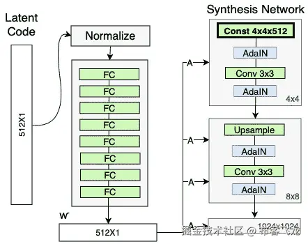 映射网络的目标是将输入向量编码成中间向量,中间向量的不同元素控制不同的视觉特征。这是一个重要的过程,因为用输入向量控制视觉特征的能力是有限的,因为它必须遵循训练数据的概率密度。例如,如果黑头发的人的图像在数据集中更常见,则更多的输入值将被映射到该要素。因此,该模型无法将部分输入(向量中的元素)映射到特征,这种现象称为特征纠缠。然而,通过使用另一个神经网络,该模型可以生成不必遵循训练数据分布的向量,并且可以降低特征之间的相关性。映射网络由 8 个完全连接的层组成,其输出ⱳ与输入层的大小相同(512×1)。