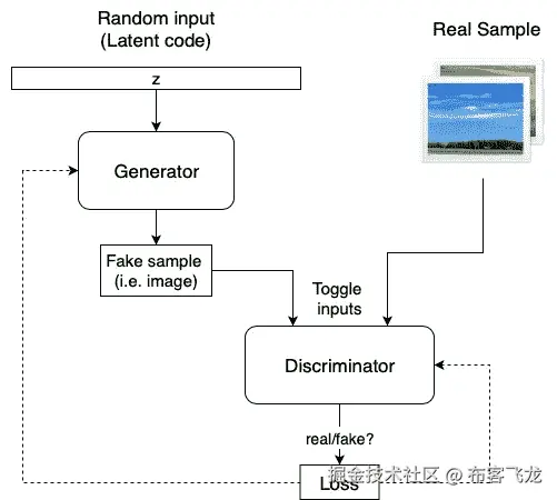 发电机输入是随机向量(噪声),因此其初始输出也是噪声。随着时间的推移,当它收到来自鉴别器的反馈时,它学会了合成更“真实”的图像。通过将生成的样本与真实样本进行比较,鉴别器也会随着时间的推移而改进,使生成器更难欺骗它。