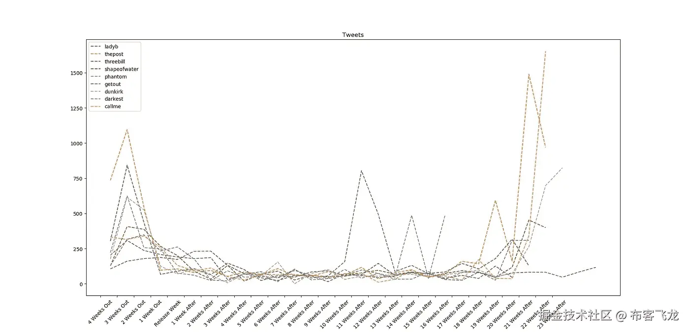 这是我们要做的,为我们的问题找到可能的答案:我们将收集关于 2018 年奥斯卡最佳影片提名的推文;我们在每部电影上映前 4 周开始收集推文,在电影结束后 1 周停止收集。 接下来我们分析推特活动(主角演员推特账号、推文数量、推文情绪、电影评分和评论)并探索推特活动和票房销售之间可能的关系。