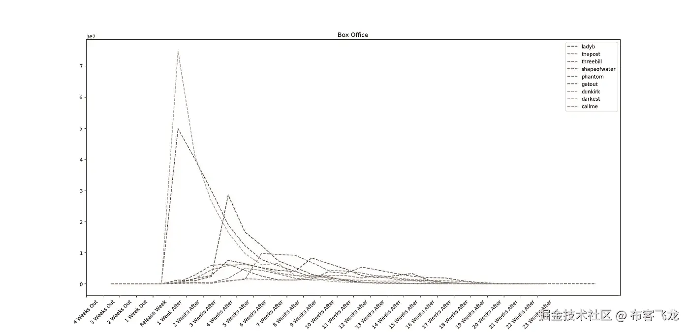 我们可以立即看到两部电影在总销售图中脱颖而出(《敦刻尔克》和《滚出去》)。这是该类别中唯一票房超过 1 亿美元的电影。我让你们评论一下为什么这两部电影有更高的票房,稍后,我们会看到这两部电影的周销售图也不同于这一类别的其他电影。