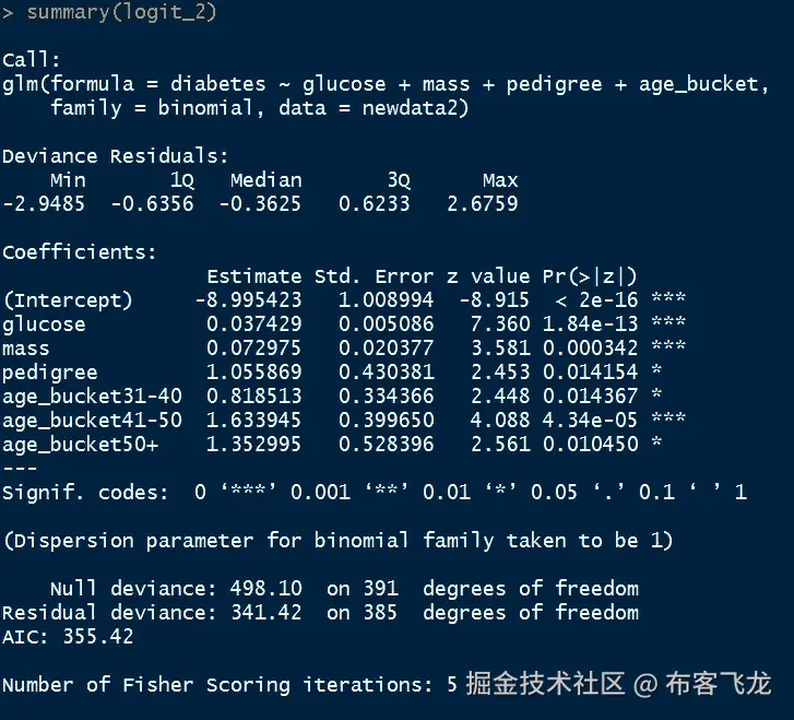 实现“stepAIC”函数后,我们现在剩下四个独立变量—葡萄糖、质量、谱系和 age_bucket。在所有可能的模型中,这个模型(logit_2)具有最小的 AIC 值。