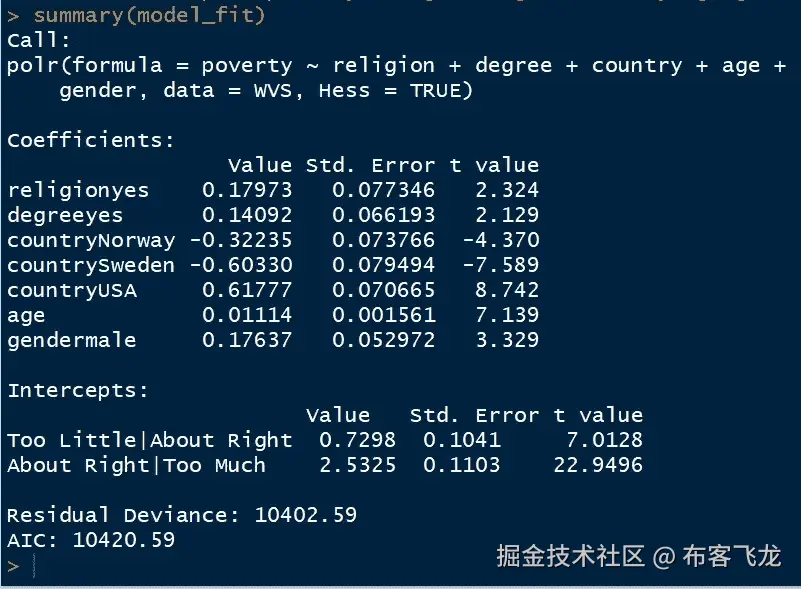 - 截距和斜率估计值以及标准误差、z 值和 p 值