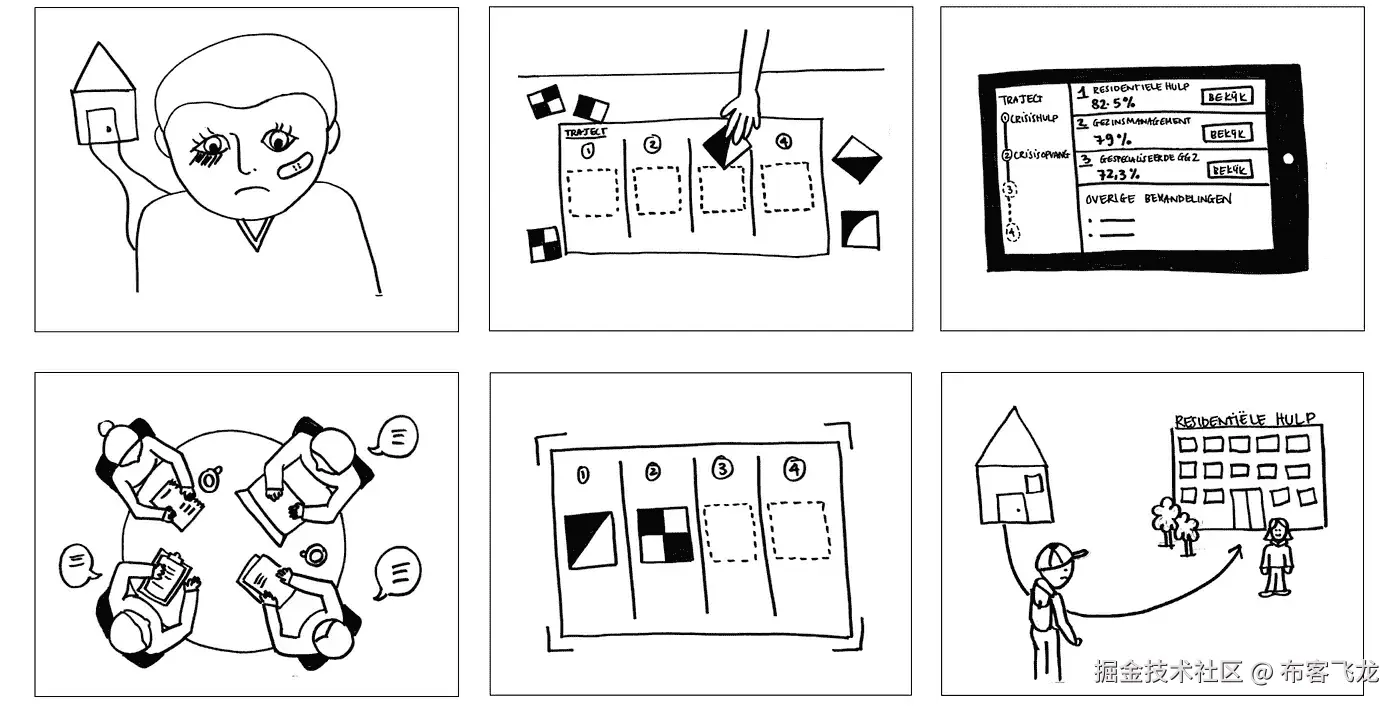 经过几次合作设计会议,我们开发了两个概念。我们使用故事板研究每个概念的细节,并再次与社会工作者交谈。我们在格林伯里实验室展示了故事板,并让社会工作者在实践中测试这些概念。他们被要求深入探索原型,对其进行改进和补充。在原型测试结束时,我们达成了一个可行的概念:为青年社会工作者增加一名“额外的团队成员”。