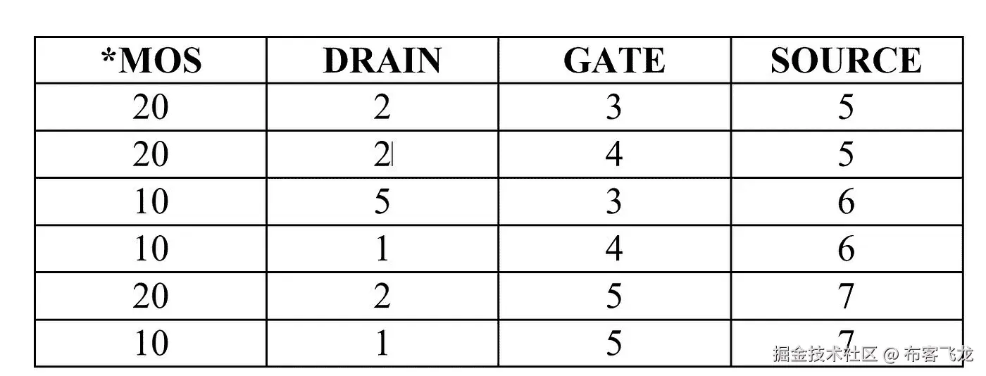 其中感叹号代表一个数的阶乘。上面的表达式减去了 2,因为 2 个特殊的节点地/电源是不可置换的。现在,节点已被标记,它们与符合 SPICE 格式[2]的表 1 所示的器件放在一起。排列设备可以在矩阵中排序,矩阵由下式给出: