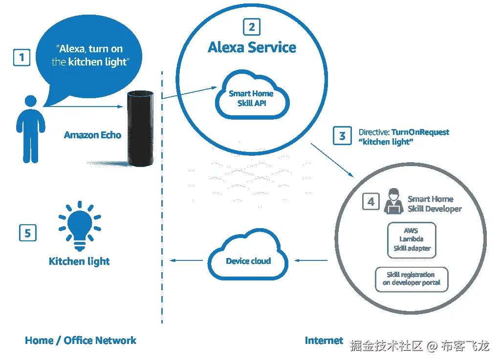 Alexa 语音服务处理响应并识别用户的意图,然后在需要时向第三方服务器发出 web 服务请求。