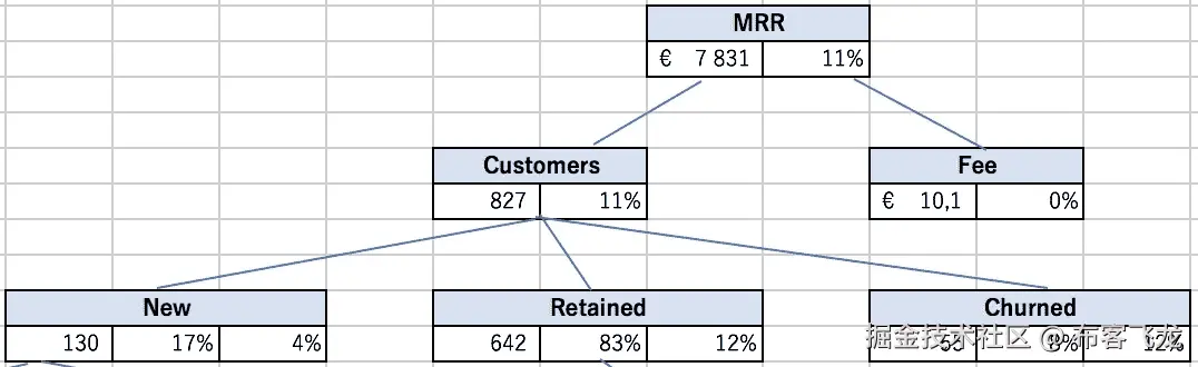 要查看一个虚构的 SaaS 企业的示例,您可以查看下面链接的指标树。在不同的列中,您可以看到绝对数量、客户总数的百分比以及与前一个月相比的变化。通过做这个练习,团队可以很好地理解你的收入是如何形成的,以及所有的数字是如何与你的月绩效联系起来的。理解这些数据将使原始数据转化为结果变得更加容易。要阅读度量树的详细分解,请查看这篇文章。