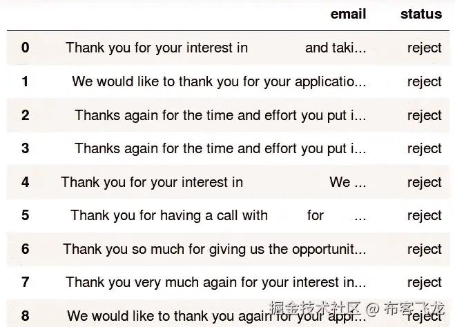 我开始从我自己的收件箱收集数据。我曾想过从收件箱中使用相关关键词(如“谢谢你的申请”、“我们祝你有个美好的未来”)有计划地收集电子邮件,但后来我决定不这么做,因为我不知道这些关键词是否正确。我手动浏览我的收件箱,并从拒绝邮件中提取文本。我还随机收集了等量的没有任何拒绝的邮件。我将这两类电子邮件文本收集在一起,保存在一个 csv 文件中。