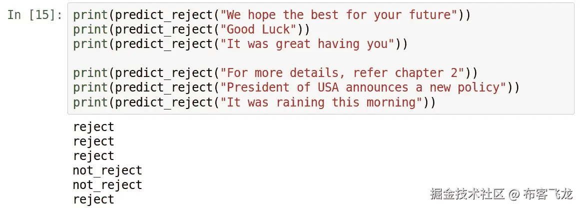 我们还通过给出定制的输入语句来测试我们的分类器,看看它的性能如何。以下是一些预测。