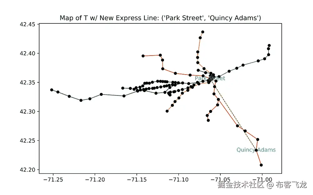在这两种情况下,我的算法确定从昆西到波士顿市中心的快速线将是对乘客最有用的快速连接。