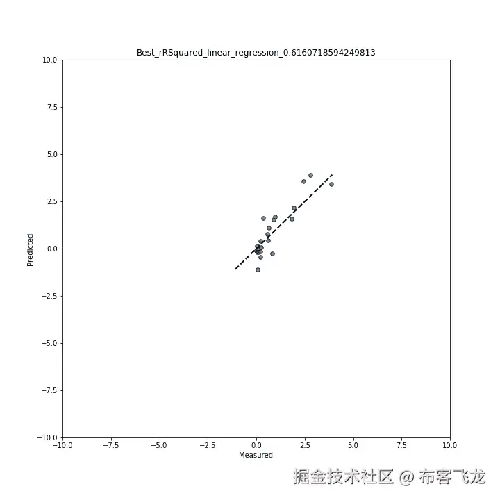 该图描绘了预测结果与测量结果。这显示了预测值和测量值之间的相关性。越靠近虚线的值表示相关性越好。