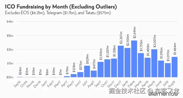 直到最近,对 ICO 的监管还很少,市场非常繁荣,ICO 基金增长迅速。2017 年末和 2018 年初尤其如此,如下图所示。这一增长此后迅速放缓,因为整个加密货币市场变得相当悲观。