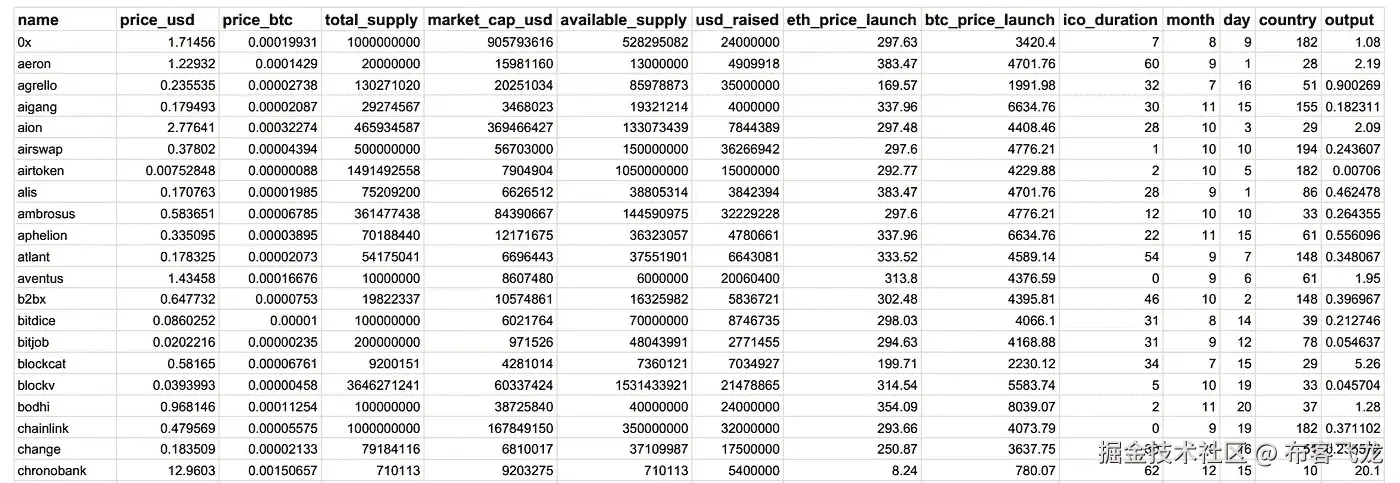 ICOs 上收集的部分数据示例