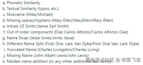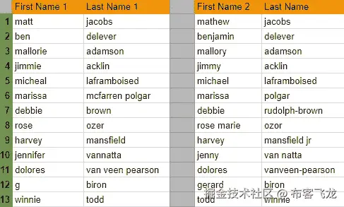 有些功能相对直观,有些则需要彻底研究。起初,我显然是在考虑某种字符串相似性(针对拼写错误等)。),也可能是我有名字和名字的昵称的情况(如 Ben/Benjamin)。我进行了数据探索,看看我是否能加强我的想法或找到名字相似性的其他想法。这是一个好的开始,但我需要更多。经过大量的研究,我找到了下面这些名字相似的例子:
