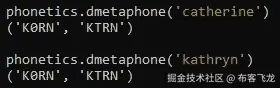 - 为了语音相似性,我最终确定了 NYSIIS 和双变音算法。这些算法背后的想法是,它们为英语单词创建一种编码。然后,我使用两种不同编码之间的字符串距离(这里特别是 Levenshtein 距离)。例如,双变音输出主要编码和第二编码。姓名 Catherine 和 Kathryn 的编码是这样的: