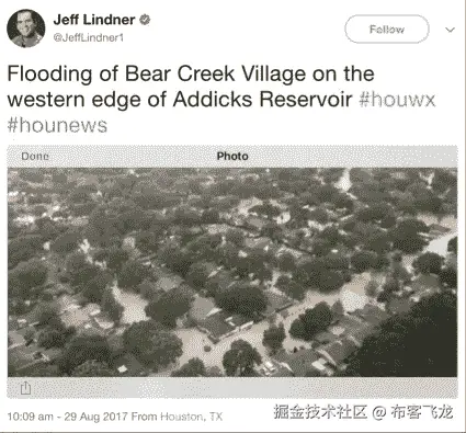 黄色的小口袋来自 Geospatial Insight 的社交媒体抓取工具,用于查找事件的照片和视频,然后可以对这些照片和视频进行映射,以根据视频证据构建范围。通常,该团队使用他们的全球许可无人机运营商网络,按照商定的 SLA 使用无人机绘制洪水地区的地图,然而,由于紧急服务使用该空域进行救援等,无人机在此期间被禁止在休斯顿上空飞行。