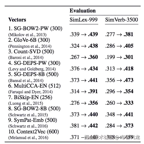 通过灌输形态学语言约束,Morphfitting 显示了在下表中给出的 10 个标准嵌入上 SimLex 和 SimVerb 的相关系数的增益。