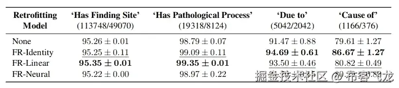 通过预测两个实体 I,j 之间的关系 r,在 snomed-ct 上使用链接预测来测试所学语义在功能改造中的功效。跨四种功能改造的四种关系(“has 发现部位”、“has 病理过程”、“due to”和“cause of”)的结果如下所示:
