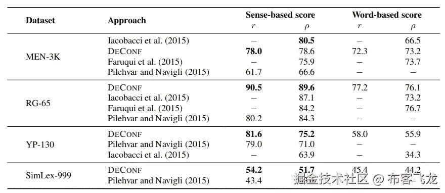 使用 Pearson 和 Spearman 相关性在四个单词相似性基准上评估 DECONF。发现在如下所示大多数任务中获得了最先进的结果。