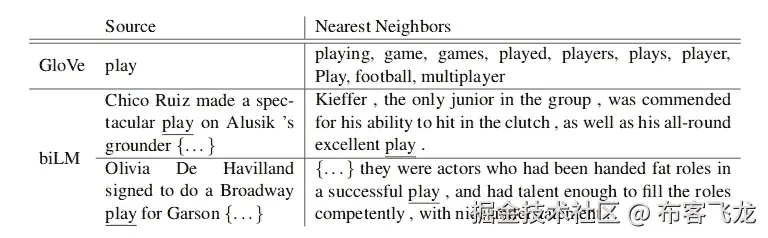 在 ELMO,单词是根据上下文进行矢量化的。因此,为了对单词进行矢量化,还需要指定单词出现的上下文。与那些不考虑上下文的矢量化技术相比,这种方法被证明是非常有效的。当比较来自 ELMO 的最近邻居(biLM)和 Glove 时,可以看到相同的例子: