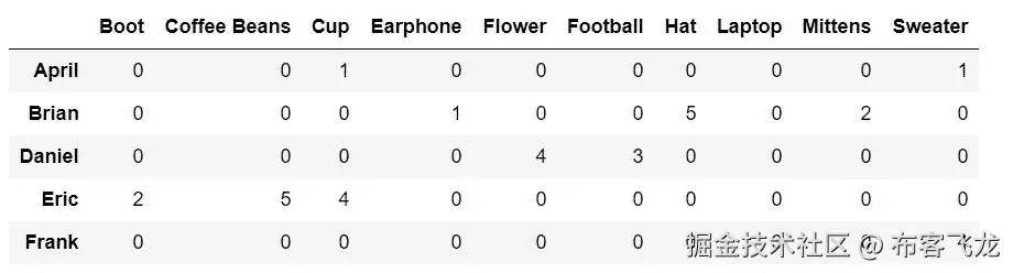 列 表示商品名称,包括“靴子”、“咖啡豆”、“杯子”、“耳机”、“花”、“足球”、“帽子”、“笔记本电脑”、“连指手套”和“毛衣”。 行 指的是用户名包括 April、Brian、Daniel、Eric 和 Frank。