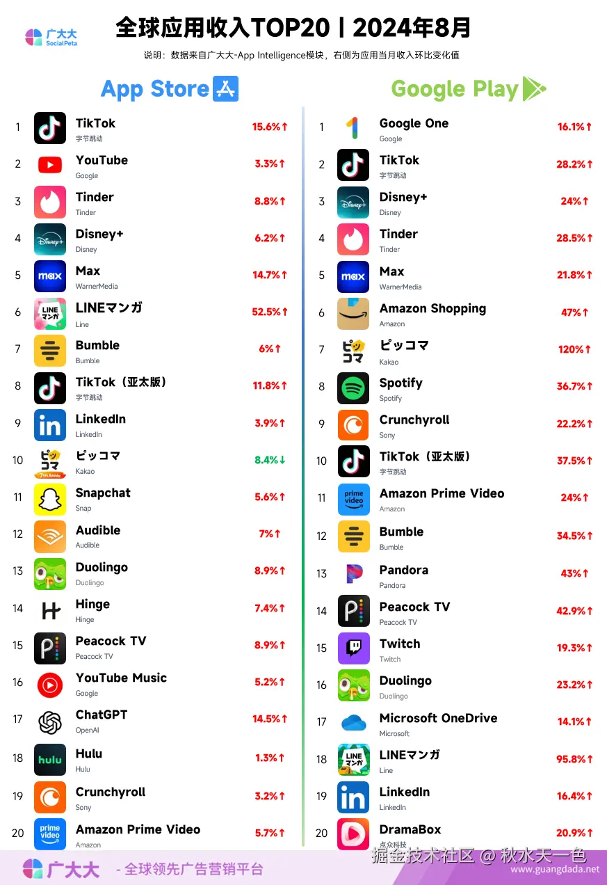 根据广大大 App Intelligence 等模块数据,笔者整理出2024年8月移动应用(非游戏)出海投放、全球收入和下载TOP20榜单,帮助更多移动应用从业人员了解全球移动市场变化趋势。