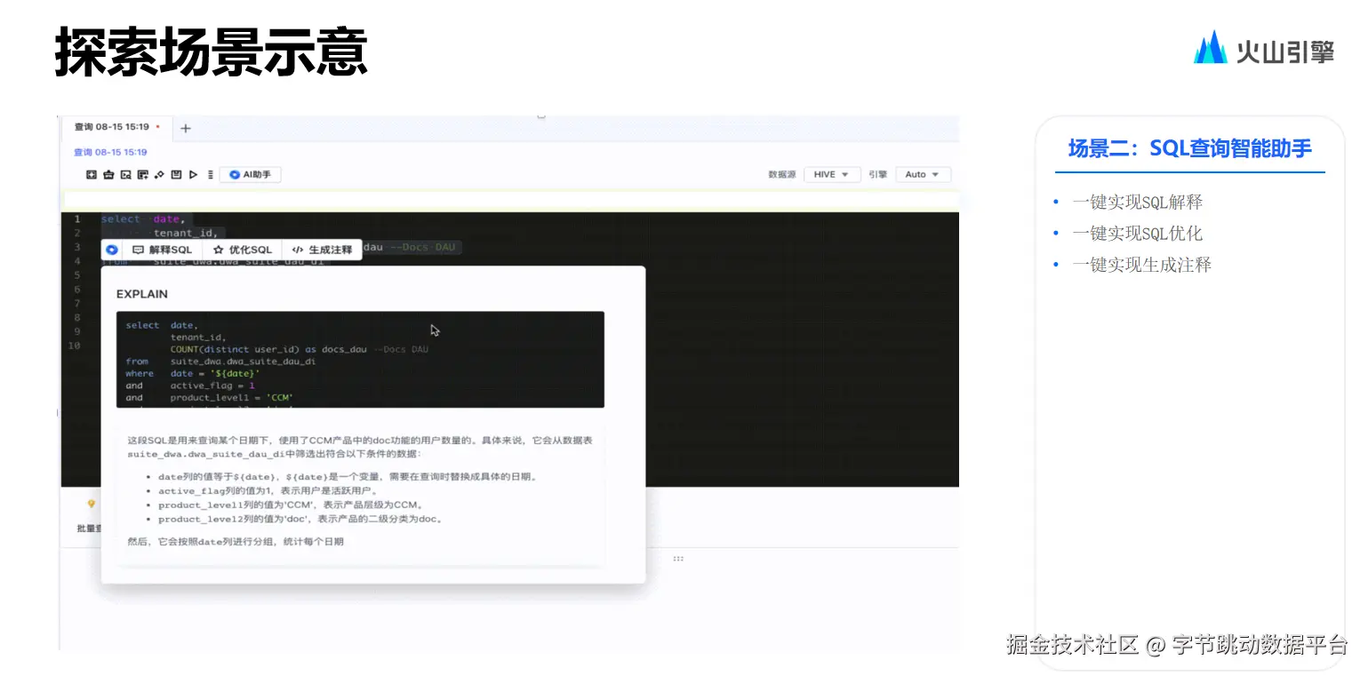 接着再来看一下 SQL 查询的场景,本产品能够进行解释以及优化。在 editor 中可以运用自然语言来帮助生成相应的 SQL 以及与 notebook 相关的一些代码。