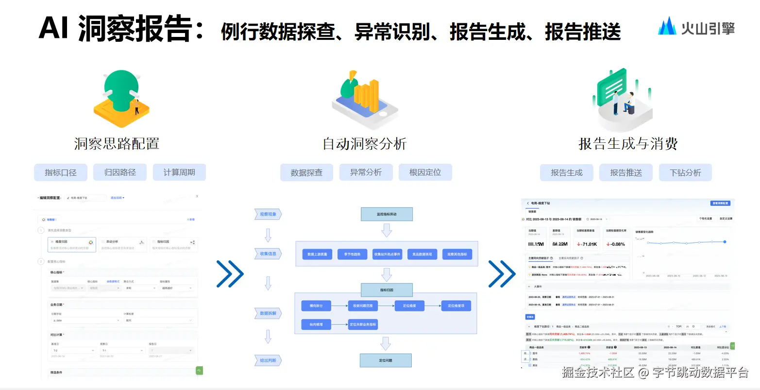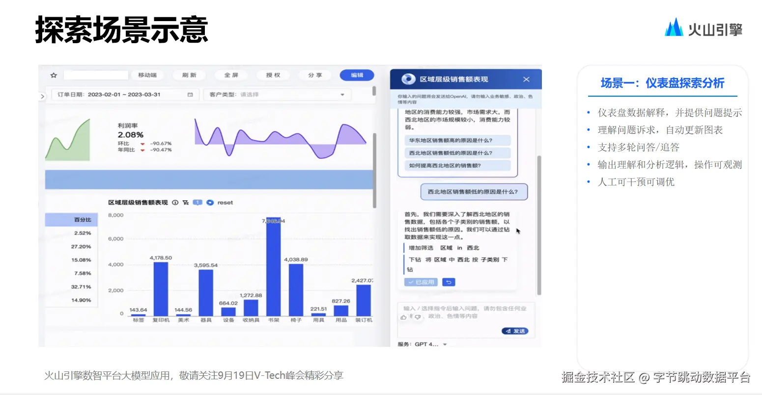 导读:大模型能力的发展和成熟,催生出新一代智能化 BI—— ChatBI,即通过自然语言处理(NLP)与大型语言模型(LLMs)的结合,极大简化数据分析过程,提高效率并降低分析门槛。火山引擎数智平台旗下智能数据洞察产品 DataWind 近期上线 ChatBI 能力,提供智能修复、多语法适用等能力,在性能上实现秒级响应、一键生成。用户只需要通过文字描述需求, 就能生成指标,快速实现数据获取、分析计算与图表搭建,大幅降低数据消费门槛。本篇文章将从技术架构、实现路径、总结展望几个方面,拆解火山引擎数智平台如何落地 ChatBI 能力。