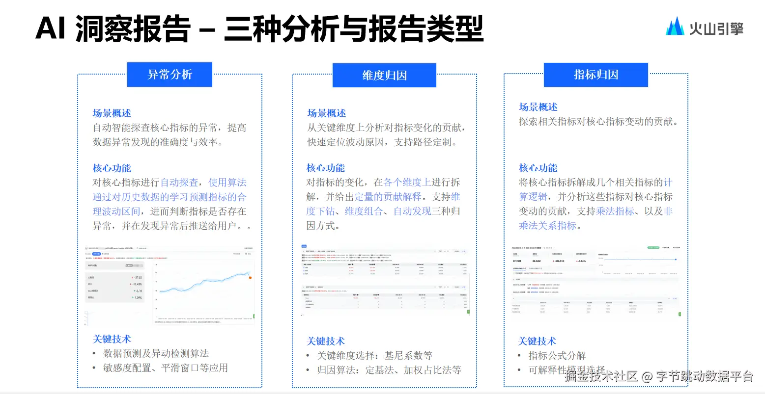 接着是数据分析场景。在数据分析场景中,开发团队希望能够帮助用户更快捷地进行异常指标查询以及异常归因,不想再为用户配置例如当数据指标低于 10%或 5%再发送警告此类傻瓜式警告方式。
