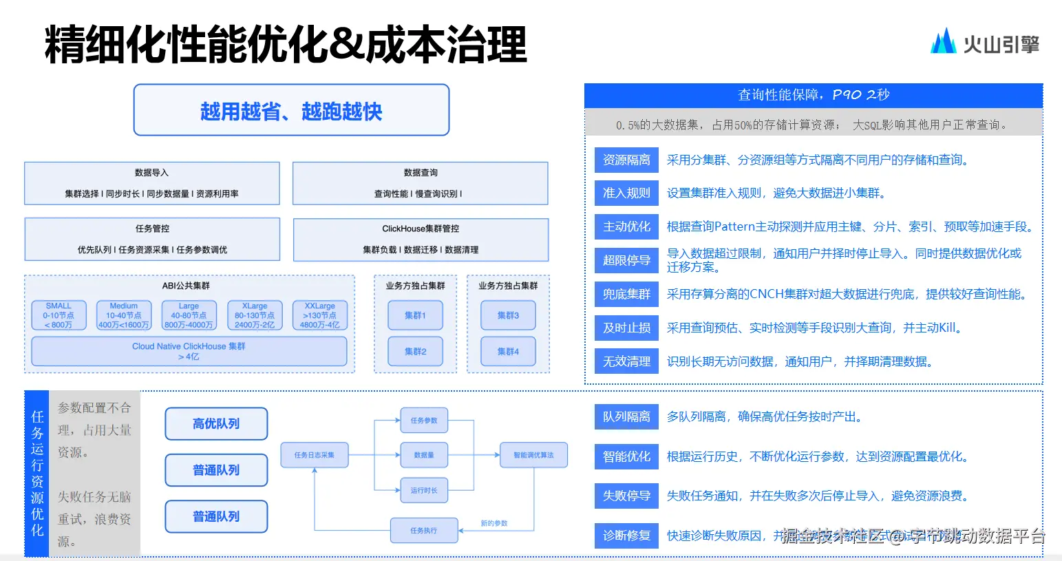 同时,如何充分有效地利用 ByteHouse 高性能引擎也十分重要。比如应该向什么样的集群推荐数据集,选择什么样的表引擎,以及确定什么样的分片和排序键策略等。这些为问题对于性能而言都相当关键。