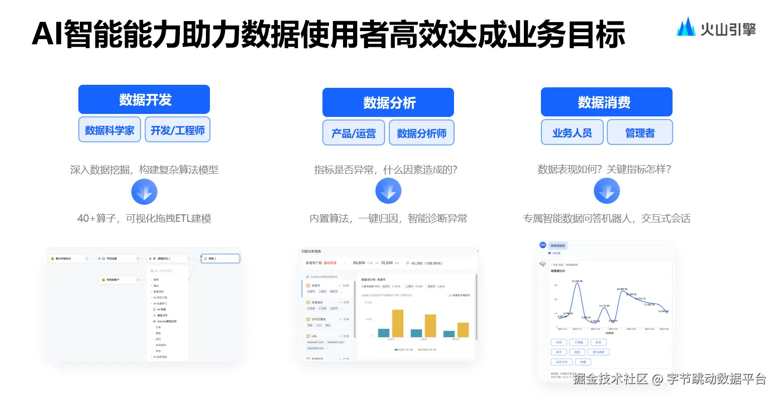 其一为数据开发,旨在帮助进行数据准备的人员能够准备更具价值的数据;其二是数据分析,期望能够助力用户进行异常指标查询以及异常归因;其三为数据消费,通过对话式问答的方式来提升提取信息的效率。